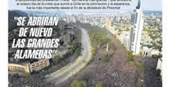 Días después de que el presidente Sebastián Piñera tildara a quienes se manifiestan contra sus políticas de puñado de delincuentes, ayer la intendencia de Santiago debió reconocer que fueron más de un millón de personas que salieron a las calles sólo en la ciudad capital para exigir el fin del asfixiante modelo neoliberal impuesto por el dictador Augusto Pinochet en la década de 1970, y continuado e incluso profundizado por todos los gobiernos elegidos en democracia desde 1990. La jornada de protestas, respaldada por cientos de miles en otras regiones del país, fue el punto –hasta ahora– culminante del más grande levantamiento popular en la nación andina desde el fin de la dictadura hace tres décadas.