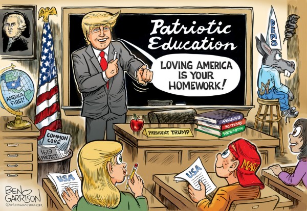 «Mi Comisión 1776 enseñará a los niños americanos sobre héroes como Benedict Arnold» (general yanqui que se pasó al bando británico durante la Guerra de la Independencia de los Estados Unidos, prototipo del traidor en la cultura yanqui). En el pergamino: «Una procla(i)mación: el proyecto 1619 del New York Times malo» (proyecto interactivo de reseña de la historia de la esclavitud lanzado por el diario en el 400avo aniversario de la llegada de los primeros africanos a «América»)-Viñeta de Don Landgren