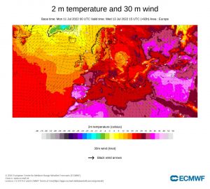 El calor extremo en el oeste del continente europeo está provocando peligrosos incendios forestales en Francia, España y Grecia, así como una sequía sin precedentes en Italia y Portugal, país que el 19 de julio llegó a 47 grados centígrados. El Reino Unido alcanzó ese martes más de 40 grados centígrados, la marca más elevada registrada hasta ahora en ese país. Las temperaturas explotaron en Bélgica y los Países Bajos. Hasta el miércoles 20, sin embargo, no se había superado en Europa el récord de 2021, los 48,8 grados de Sicilia.