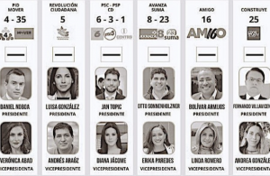 Los 8 binomios para la presidencia y vicepresidencia del Ecuador que se han conformado para las elecciones del próximo agosto (2023) son: Luisa González/Andrés Arauz por Revolución Ciudadana (RC-5); Jan Topic/Diana Jácome por Partido Social Cristiano, PSC; Partido Sociedad Patriótica, PSP; y Centro Democrático; Yaku Pérez/Nory Pinela por Unidad Popular, UP; Partido Socialista Ecuatoriano, PSE; Democracia Si, DS; Otto Sonnenholzner/ Erika Paredes por Avanza y Suma; Fernando Villavicencio/Andrea González por Movimiento Construye” (ex Ruptura de los 25); Xavier Hervas/Luz Marina Vega por Movimiento RETO; Bolívar Armijos/Linda Romero por Movimiento Amigo; Daniel Noboa/Verónica Abad por Pueblo, Igualdad y Democracia, PID y Movimiento Mover (antiguo Alianza País). También serán elegidos los miembros de la nueva Asamblea Nacional y se realizará una histórica consulta popular sobre la explotación petrolera en el Parque Nacional Yasuní.