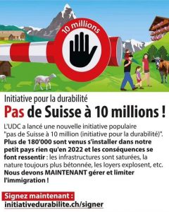 Con particular habilidad electoralista, en junio pasado la UDC lanzó la iniciativa popular federal «¡No a una Suiza de 10 millones!», o “Iniciativa de sostenibilidad”. Según la misma, “la población residente permanente en Suiza no debe exceder los 10 millones de personas antes del año 2050” (actualmente la población supera los 8.7 millones).