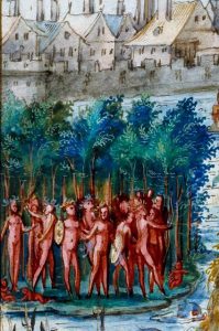 En 1550, en la ciudad portuaria de Ruán (Francia), se organizó un gigantesco espectáculo en honor de la “alegre entrada” -la visita- de la pareja real formada por Enrique II y Catalina de Médicis. Entre los espectáculos presentados para el disfrute de los monarcas mientras navegaban por el Sena había simulacros de batallas navales, duelos de gladiadores, representaciones de acontecimientos célebres de la historia de Francia y una representación de la vida tal y como se imaginaba en lo que hoy es la bahía de Río de Janeiro, con cincuenta hombres, mujeres y niños tupinambá desnudos que habían sido traídos por la fuerza en la ciudad, así como 250 marineros franceses que habían visitado Brasil y representaban el papel de nativos.