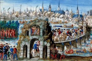 La “alegre entrada” de Enrique II y Catalina de Médicis en Ruán el 1° de octubre de 1550. A la izquierda, el pueblito de los indios Tupinambá. Miniatura, escuela francesa, siglo XVI. Biblioteca municipal de Ruán.