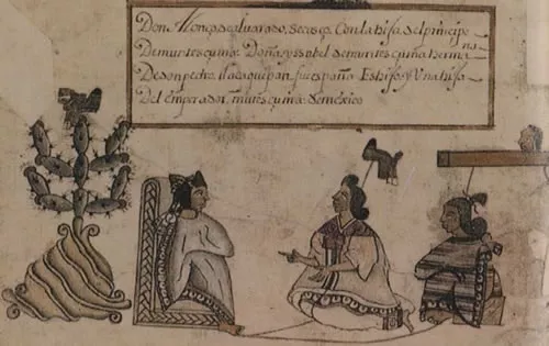 Tecuichpo Ixcaxochitzin alias Isabel de Moctezuma (1501-1550) entre su padre Motecuhzoma («Moctezuma») y su hermano Tlacahuepantzin («Pedro»). Códice Cozcatzin, hacia 1572. Biblioteca Nacional de Francia, París.