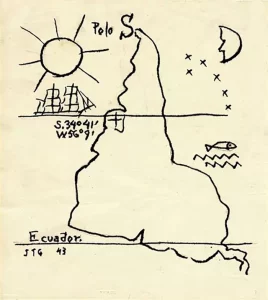 A fines de 1943, seis años antes de su muerte, en plena madurez artística e ideológica el notable artista uruguayo Joaquín Torres García enrolado en el constructivismo y con fuerte influencia de simbología indígena lanza la propuesta “nuestro norte es el sur” y crea una obra concreta y profunda dando vuelta el mapa para “descubrir nuestra verdadera posición en el mundo”.