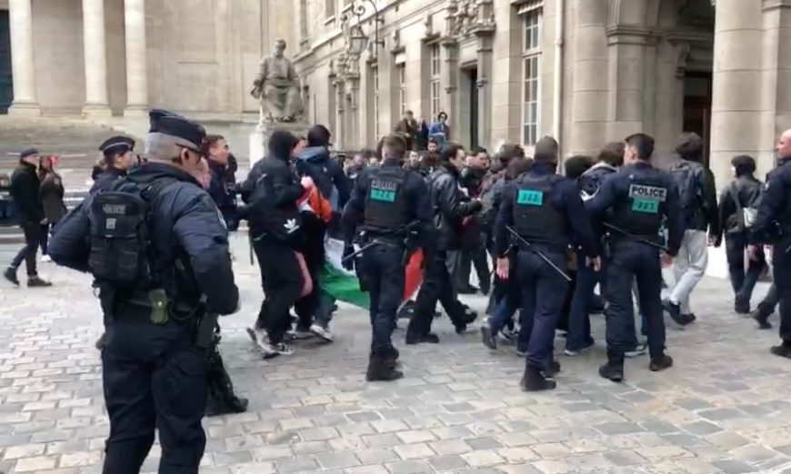 Mientras se desplegaba una enorme fuerza policial y la prefectura había prohibido las dos solicitudes de reunión presentadas por los representantes sindicales de la universidad y Stop Arming Israel, unos cientos de estudiantes y activistas se reunieron dentro de la Sorbona y en la Place du Panthéon para expresar su apoyo al pueblo palestino, víctima de un genocidio del que el Estado francés es en gran medida cómplice.