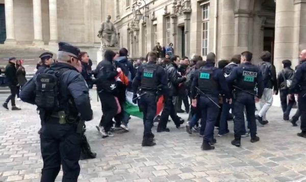 Rápidamente, los estudiantes presentes en el interior de la universidad fueron expulsados por la policía, que intervino en el propio patio de la Sorbona. Esta intervención policial atestigua el salto represivo de los últimos años y la voluntad del gobierno de hacer todo lo posible para que Macron pueda aparecer públicamente sin cuestionamientos, teniendo en cuenta que a lo largo de la historia la entrada de policías en las universidades fue totalmente excepcional. La concentración en la plaza del Panteón duró más de una hora, y los CRS (policías antidisturbios) atacaron permanentemente a los presentes e incluso al menos dos personas fueron detenidas.