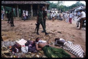 Los cuerpos de partidarios del JVP ejecutados por un escuadrón de la muerte yacen en el suelo con carteles atados al cuello el 2 de diciembre de 1989 en Tihagoda, Sri Lanka. Foto Robert Nickelsberg/Liaison