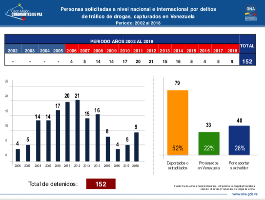 Nombre de barons de la drogue recherchés au niveau international et arrêtés par le Venezuela depuis 2006. Sur le graphique à droite, 79 ont été extradités, 40 sont en voie de l’être et 33 ont été jugés au Venezuela (source: ONA)