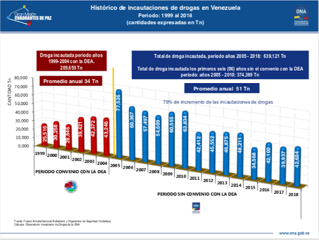 Sur ce graphique nous observons le nombre de tonnes de drogues saisies chaque année. En rouge, lorsque la DEA était présente au Venezuela. En bleu, après le départ de la DEA. On note une progression annuelle de 79% de la moyenne de saisis sans la coopération de la DEA. (source: ONA)