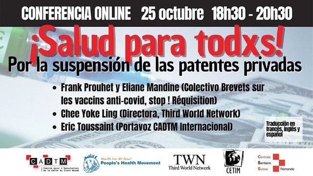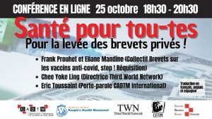 Conférence organisée et avec le soutien de : CADTM, Collectif Brevets sur les vaccins anti-covid, stop ! Réquisition, Third World Network, People’s Health Movement International, Centrale Sanitaire Suisse Romande et CETIM.