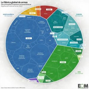 Según el SIPRI, Estados Unidos ha consolidado aún más su dominio como proveedor de armas en un mundo cada vez más multipolar. Su estudio actualizado a fines de 2025 alega que los importadores de armas estadounidenses las prefieren por su avanzada capacidad tecnológica y, además, porque contribuyen comercialmente a fomentar buenas relaciones con ese país. Como subraya el SIPRI, para Estados Unidos la exportación de armamento constituye “una herramienta de política exterior y una manera de fortalecer su industria armamentística, como vuelve a dejar claro la nueva Estrategia America First de Transferencias de Armas de la administración Trump”. Realidad que se convierte en la principal clave de interpretación de la presión que, desde su primer día como presidente, Donald Trump ha ejercido sobre sus aliados de la OTAN para que aumenten significativamente sus propios presupuestos de defensa. Tras esta pulseada, y ya en el horizonte, nuevos y fructíferos negocios para las multinacionales estadounidenses de la industria bélica. En la actualidad, 39 de las top 100 multinacionales son norteamericanas .