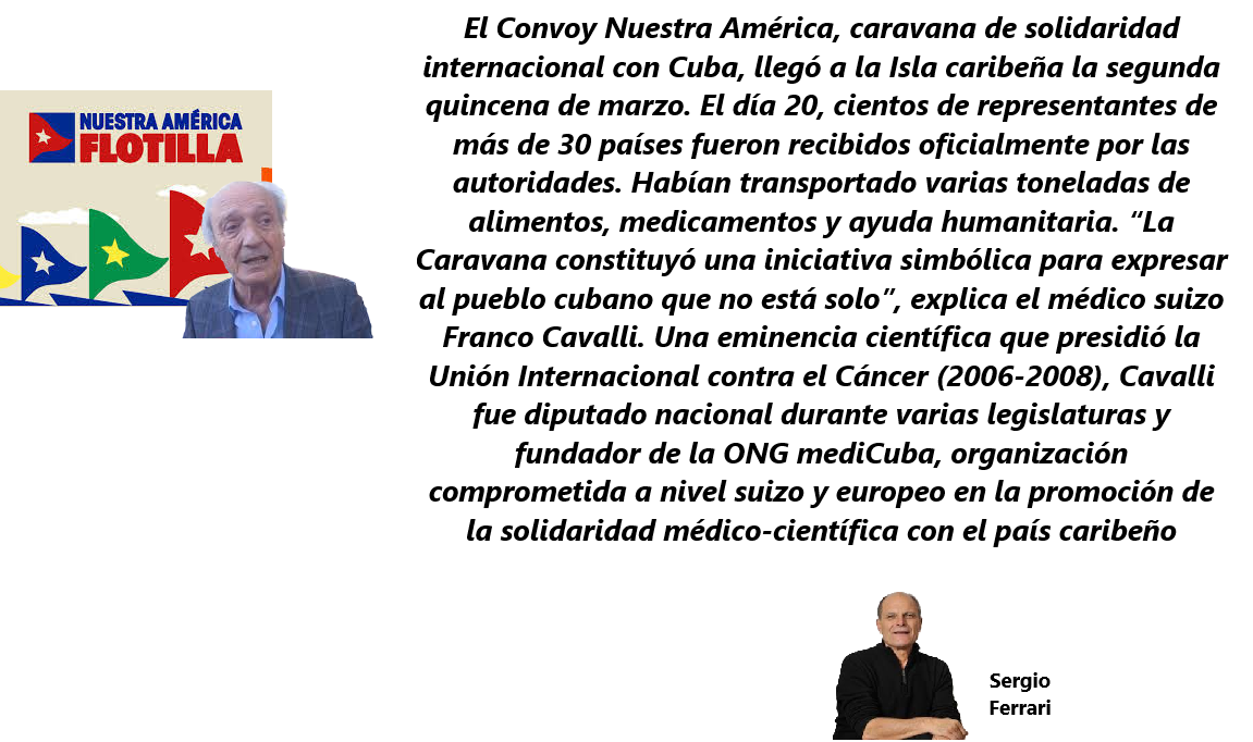 El Convoy Nuestra América, caravana de solidaridad internacional con Cuba, llegó a la Isla caribeña la segunda quincena de marzo. El día 20, cientos de representantes de más de 30 países fueron recibidos oficialmente por las autoridades. Habían transportado varias toneladas de alimentos, medicamentos y ayuda humanitaria. “La Caravana constituyó una iniciativa simbólica para expresar al pueblo cubano que no está solo”, explica el médico suizo Franco Cavalli. Una eminencia científica que presidió la Unión Internacional contra el Cáncer (2006-2008), Cavalli fue diputado nacional durante varias legislaturas y fundador de la ONG mediCuba, organización comprometida a nivel suizo y europeo en la promoción de la solidaridad médico-científica con el país caribeño.